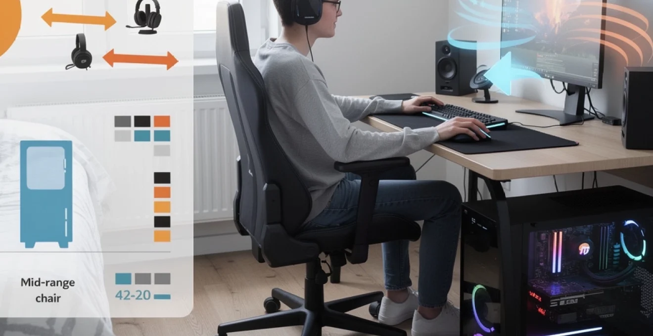 La hauteur de la chaise et du bureau doit permettre aux avant-bras de rester parallèles au sol, coudes à environ 90°, poignets neutres sur le clavier et la souris. Vos pieds doivent reposer à plat, quitte à utiliser un repose-pied improvisé. Dans une chambre, où l’espace est souvent contraint, on privilégiera un bureau gaming compact mais profond (60 cm minimum) pour garder une bonne distance d’écran. Vous pouvez également surélever l’écran avec un bras articulé, ce qui libère de la surface sur le bureau et améliore la posture.